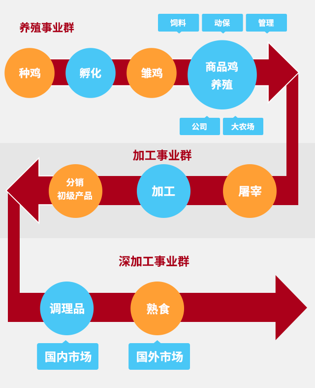 • 公司商品代肉雞養(yǎng)殖主要采取“公司+大農(nóng)場”的經(jīng)營模式,對農(nóng)場實(shí)施“九統(tǒng)一”的流程化管理(統(tǒng)一選址布局、統(tǒng)一規(guī)劃建設(shè)標(biāo)準(zhǔn)、統(tǒng)一供應(yīng)雛雞、統(tǒng)一防疫消毒、統(tǒng)一供應(yīng)飼料、統(tǒng)一供應(yīng)藥物、統(tǒng)一技術(shù)指導(dǎo)、統(tǒng)一檢測、統(tǒng)一屠宰加工)